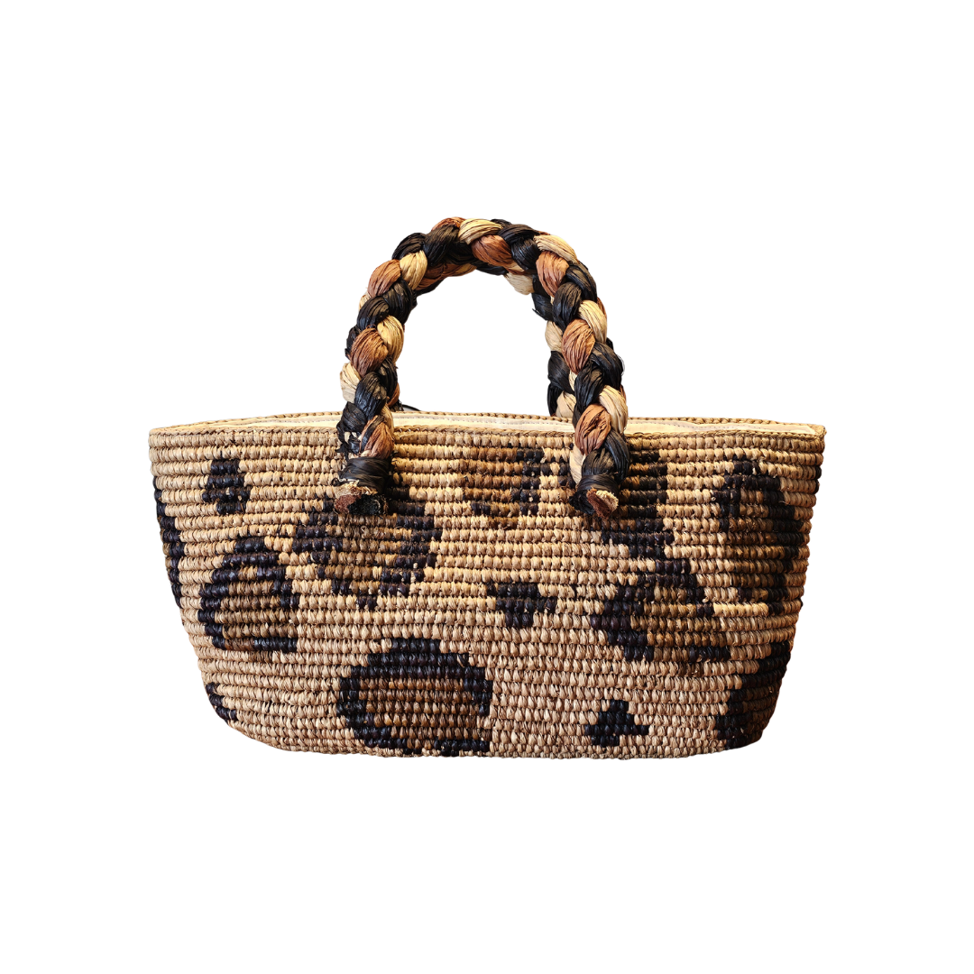 Holen Sie sich mit unserer aus Bast gehäkelten Handtasche ein Stück Sommer in Ihren Alltag! Die auffällig gestaltete Tasche ist der perfekte Begleiter für ein sommerliches Outfit. Sie verfügt über eine Innentasche aus ungebleichtem Baumwollstoff und einen Reißverschluss, sodass all Ihre persönlichen Gegenstände sicher verstaut sind. Mit einer Breite von ungefähr 40 cm, einer Höhe von etwa 20 cm und einer Tiefe von ca. 15 cm ist die Tasche ein echtes Raumwunder. Das Muster der Tasche zitiert das Fellmuster eines Jaguars, während sich die Hauptfarben im auffälligen Henkel wiederfinden.
