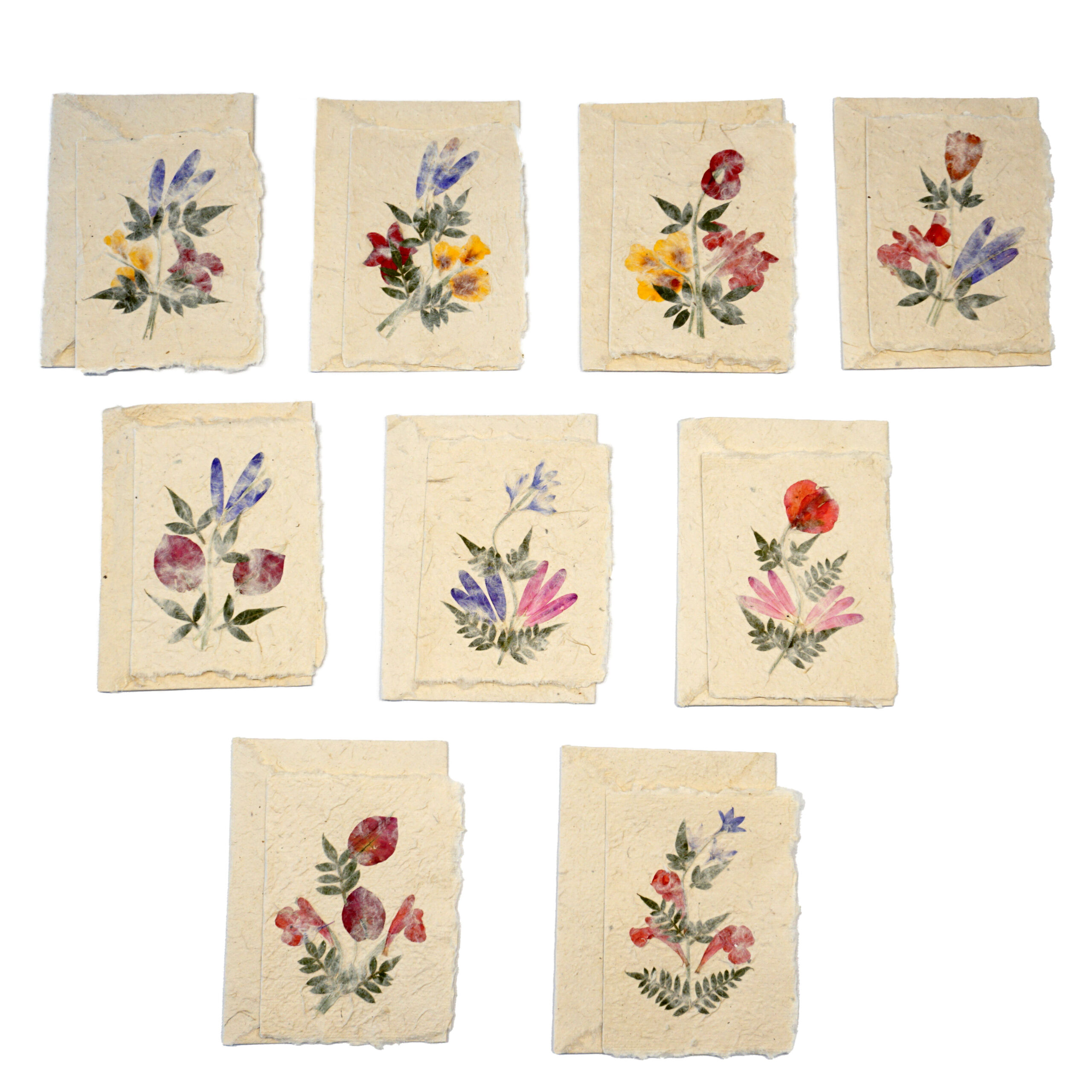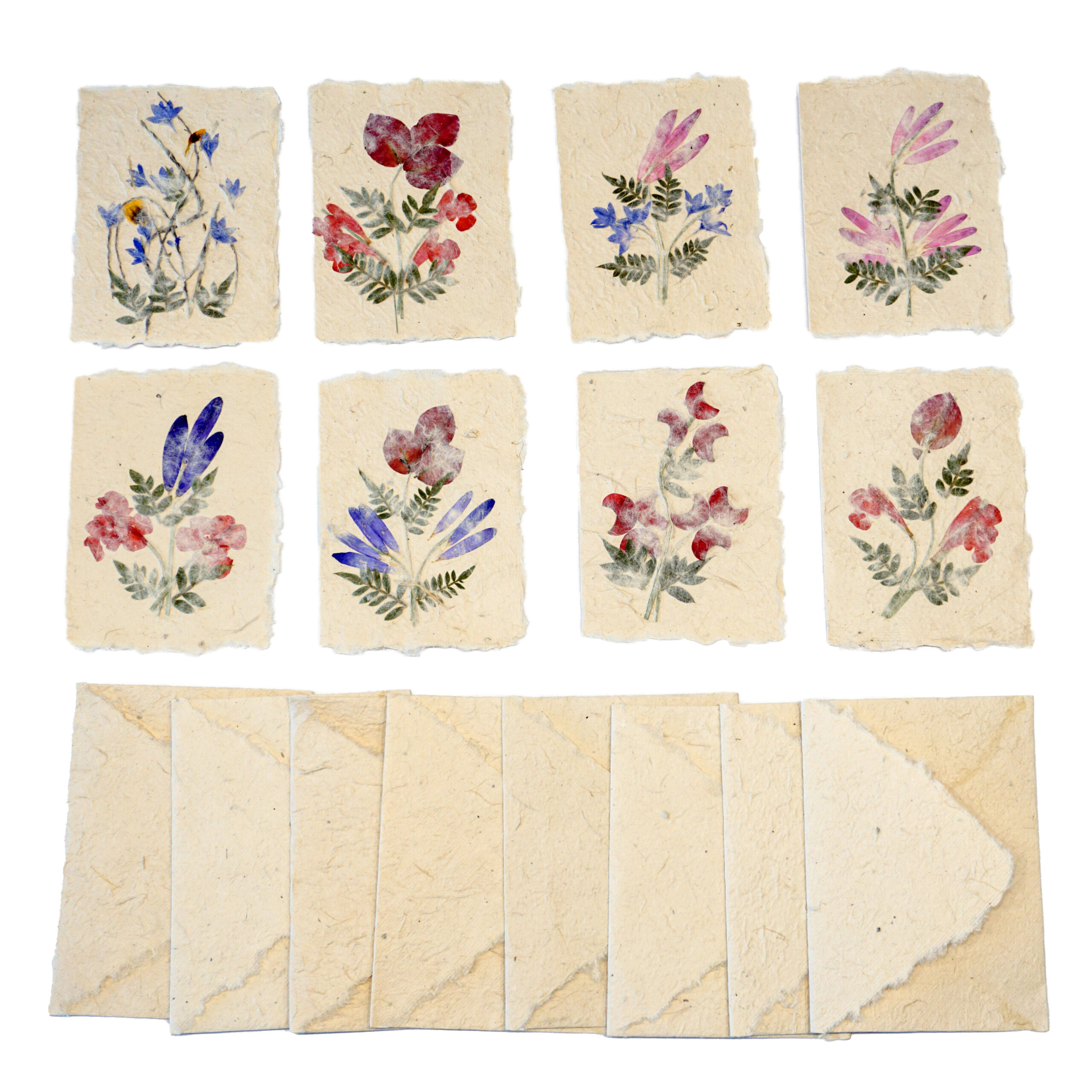 Einzigartige Klappkarte mit einem floralen Motiv aus getrockneten Blüten und passendem Umschlag aus handgeschöpftem Papier (100 % natürlich und nicht gebleicht).